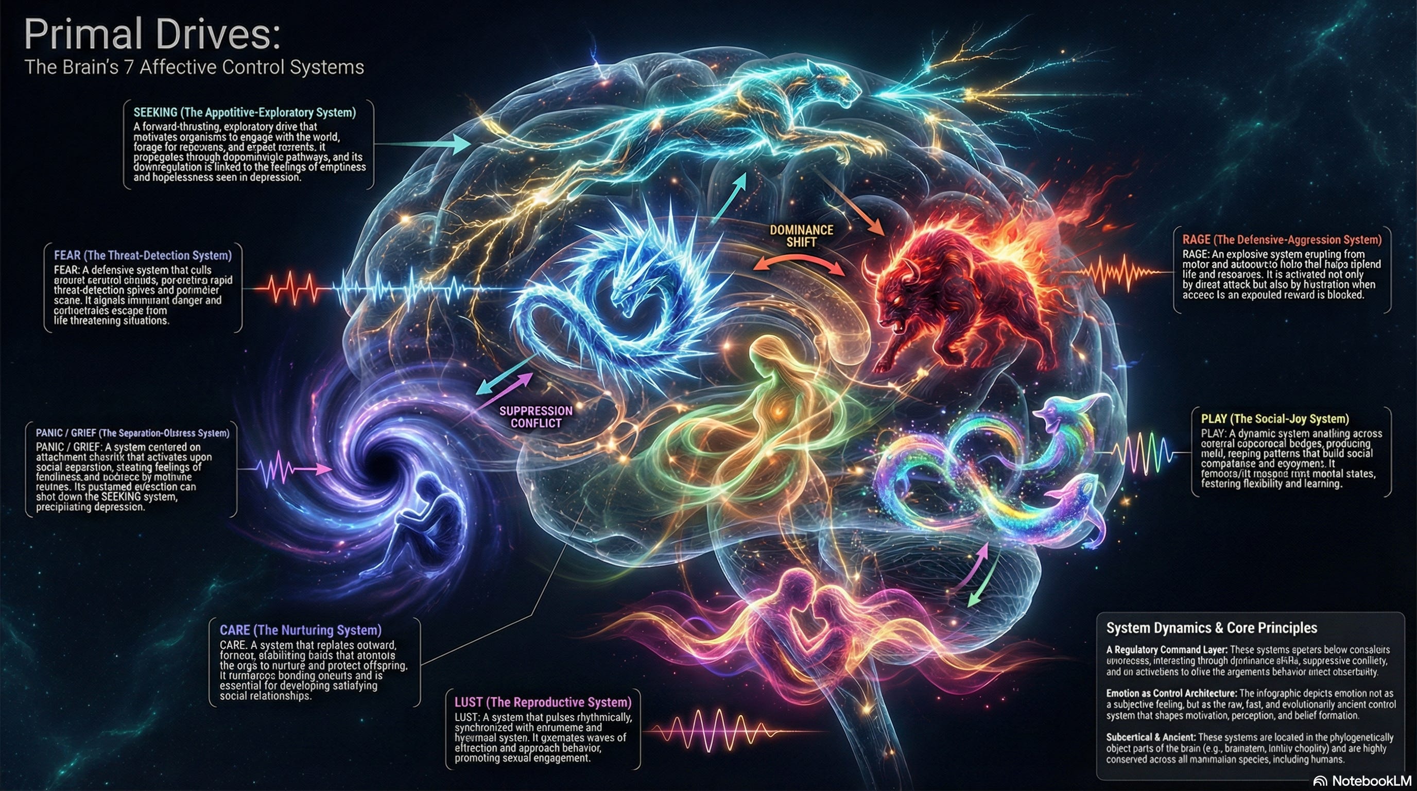 These concepts lay the groundwork for Panksepp’s 7 emotional systems. In this framework, emotion is affect + perception + learning + context + action tendency. For Panksepp, that meant these 7 systems, which he found across mammalian species and considered affective generators. I’ve taken the explanations from a brilliant paper by Panksepp and Christian Montag: Primary Emotional Systems and Personality: An Evolutionary Perspective.