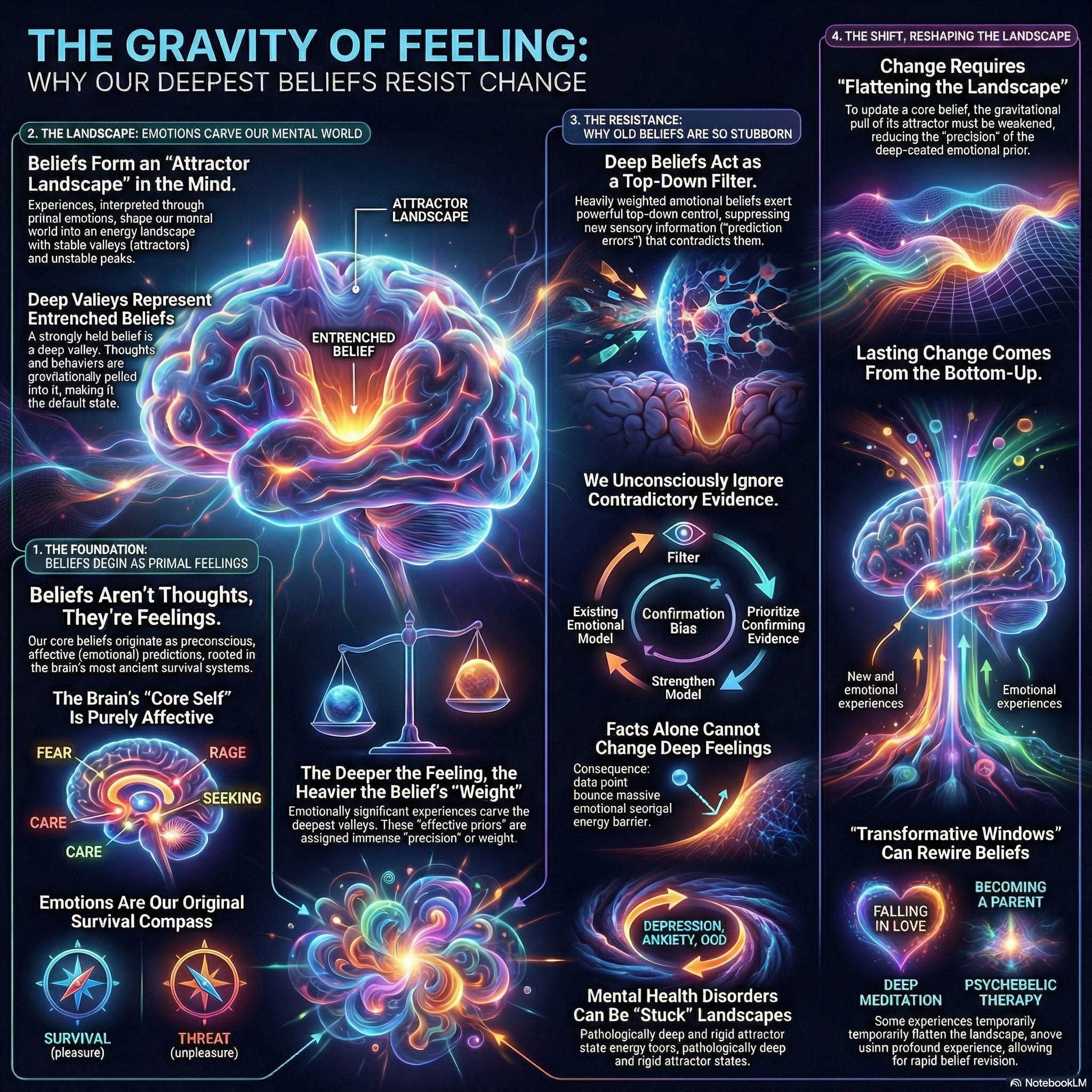 Beliefs as hierarchical, preconscious affective priors: embodied predictions weighted by hedonic valence, shaped by evolutionary constraints, critical periods, and environmental interactions. They aren’t freely “chosen”, hence the title Unchosen Beliefs, rather they’re emergent from allostatic processes, resistant to superficial cognitive overrides, and updated only through experiential, bottom-up reweighting.