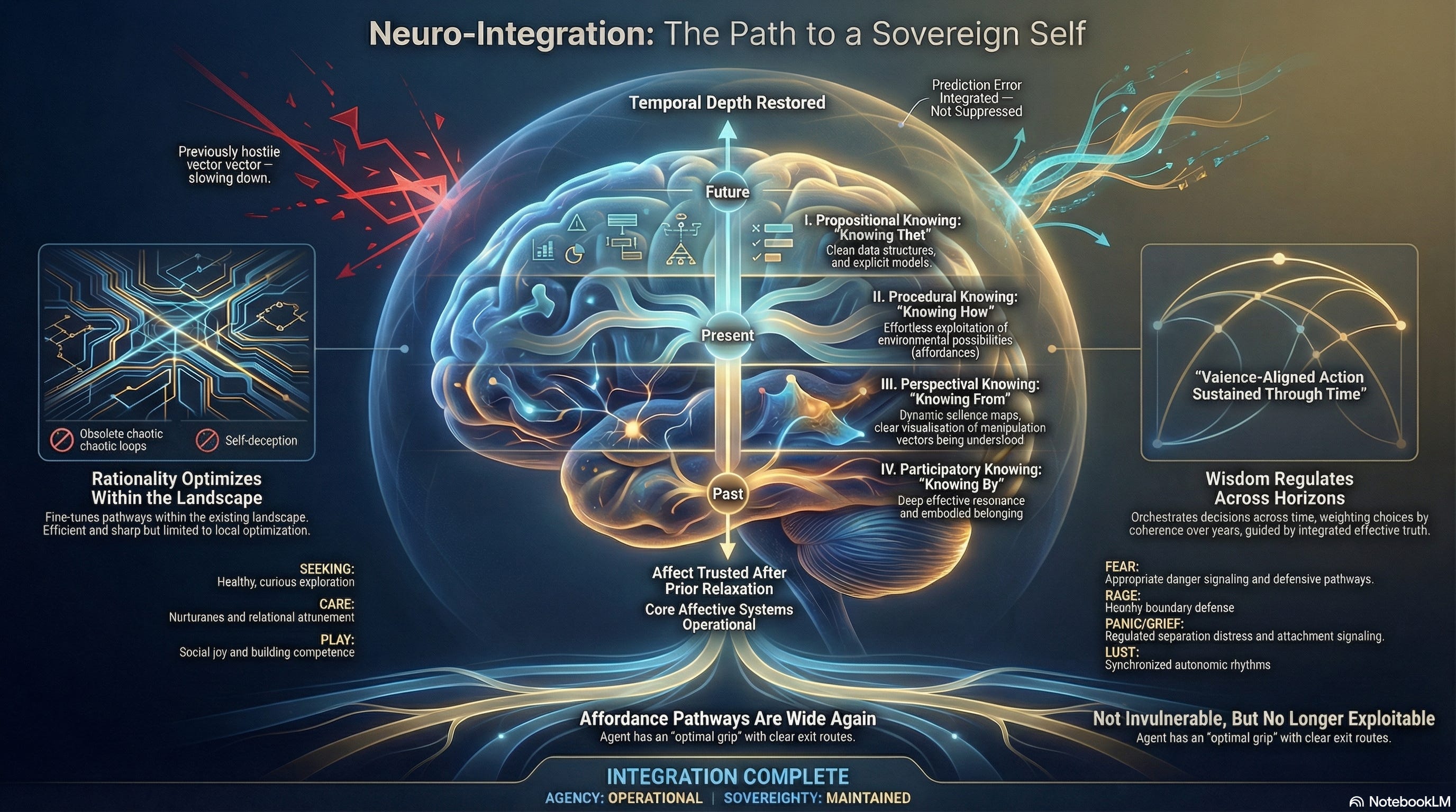 Wisdom navigates this extended temporal depth by participating in valence-charged reality (windows like love/curiosity/flow), realizing relevance (what feels meaningfully true), and integrating affective truth across horizons. So in the end, it’s not imposing cognition, it’s about aligning with the participatory flow for agentic adaptation (the things that make you feel more you). In my work with clients, I’ve adopted Paul Conti’s term called generative drive. Which is essentially this ability to recognize, orient and execute on those aspects that feel right to you. This is a key part of self-trust, since our affective models drive cognitive ones, changing those attractor landscapes lends to a better interpretation of all these models. Hence, wisdom is trusting valence-aligned updates, because only you can feel what is right for you. And I don’t mean pleasurable in a hedonistic sense, I mean right across your hierarchy of beliefs and values. We could argue that this is partially where rationality and wisdom converge: not imposing cognitive beliefs, but cultivating awareness to trust and integrate the affective ones that actually run the show.