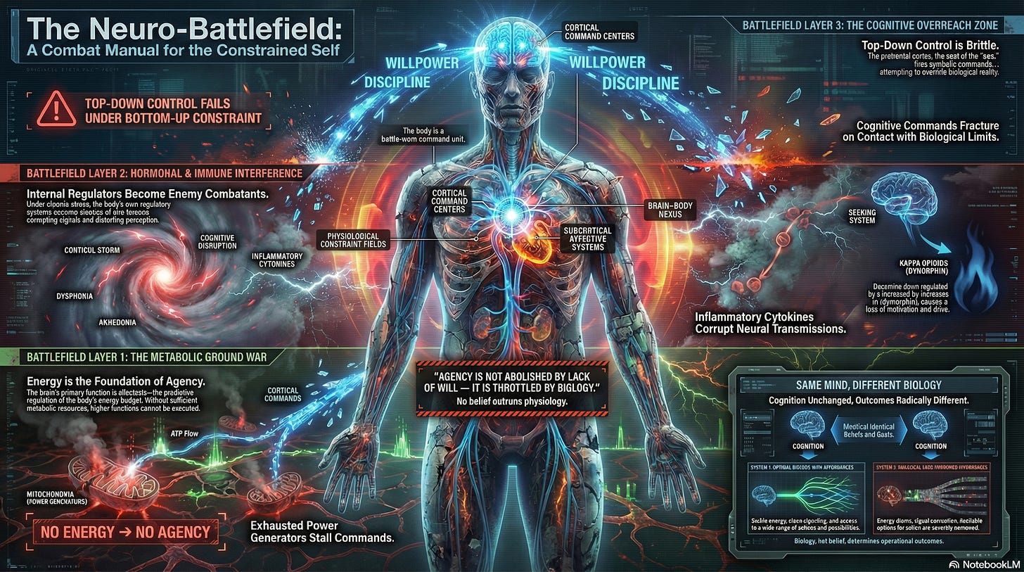 Considering the amount of time we took on outlining the effects of those neuromodulators on our experiences, neuroanatomy, neurological function, and what it does to our attractor landscapes and priors, it makes sense that changes there have significant consequences across the board. That would also mean that any factor that disrupts that, like stress or inflammation, would have an impact. Which is clear in the data on chronic inflammation (elevated cytokines like TNF-α, IL-6) and how it tightens priors and blunts placebo by altering neurotransmitter balance and immune-brain signaling [2][4].