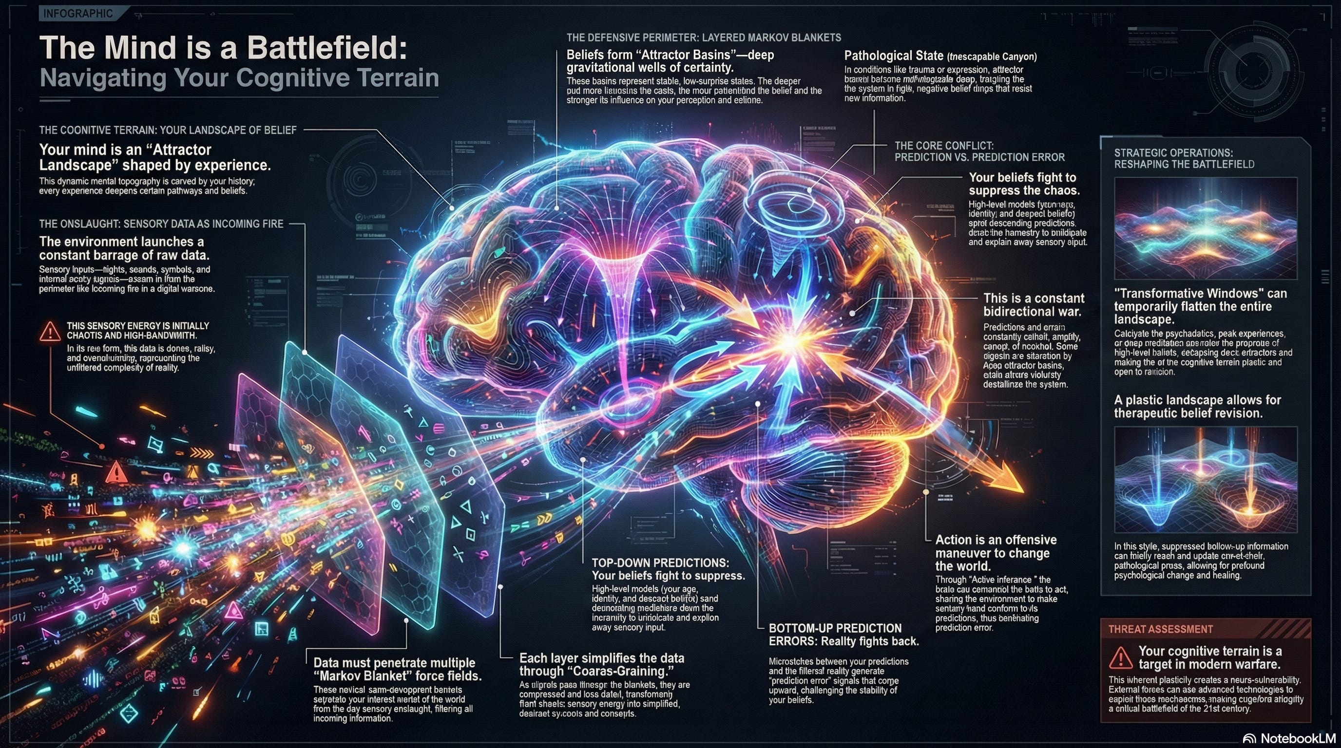 The idea is that these models attempt to minimize surprise, called free energy, over time, so we can stay in preferred states and reduce uncertainty. They form the priors, the initial datasets of information around which data self organizes or structure. This formation of information towards which things keep gravitating or being pulled towards is called an attractor state. Since we have critical windows of development, and certain experiences that happen within those developments, and experience carves a landscape of attractors, an attractor landscape that is supposed to help us survive. Think of the attractor landscape like valleys in a landscape, the system “rolls” into familiar, low-surprise attractors shaped by past threats/rewards. This will be expanded as we move through this article.