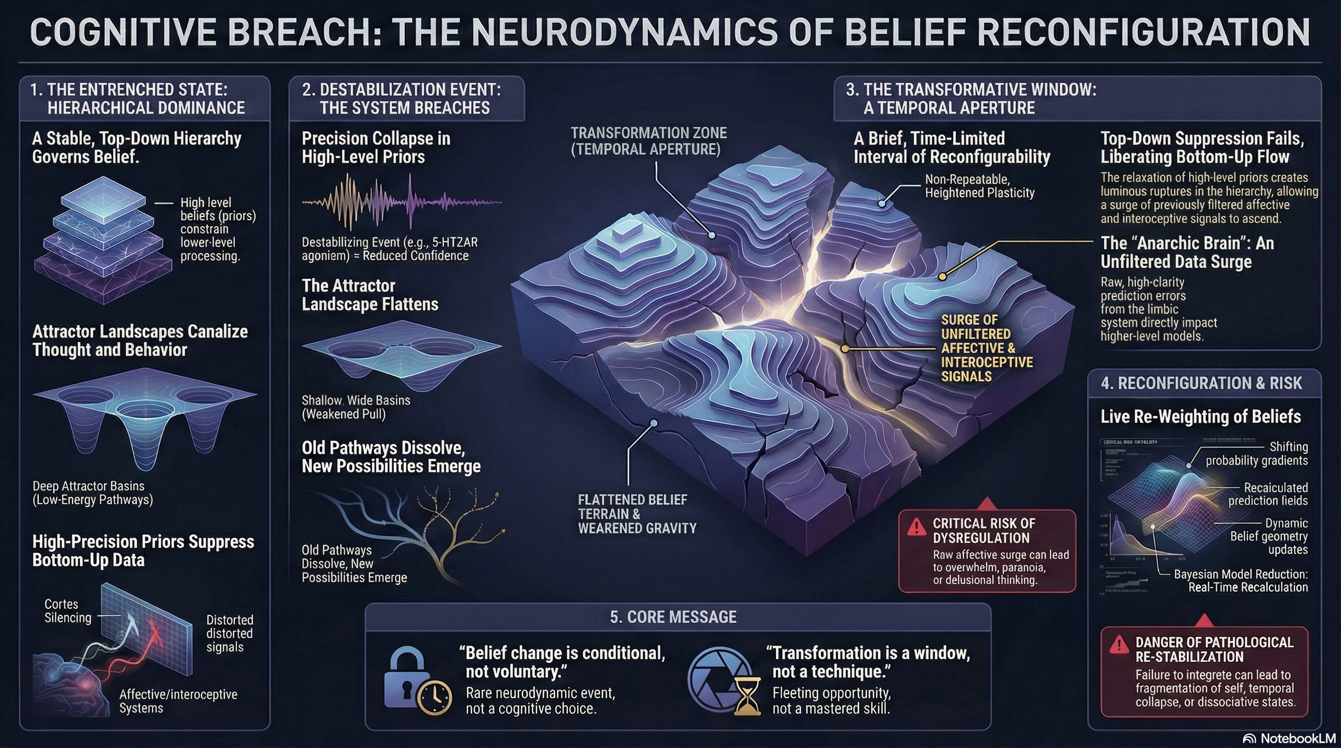 The other route is that the catalyst has to, in some way, collapse the attractor landscape and make it “soft”, or rather, pliable/plastic again. Which is fundamentally what change requires, the collapsing of those heavy attractors through valence-charged experiences that relax priors from the bottom up. Because we need that in order to get the higher-order hierarchy layers to “accept” the bottom-up information flowing in. Since these higher-order layers have been quite literally gatekeeping. There are a few of those catalysts that relax priors and collapse the attractor landscape.