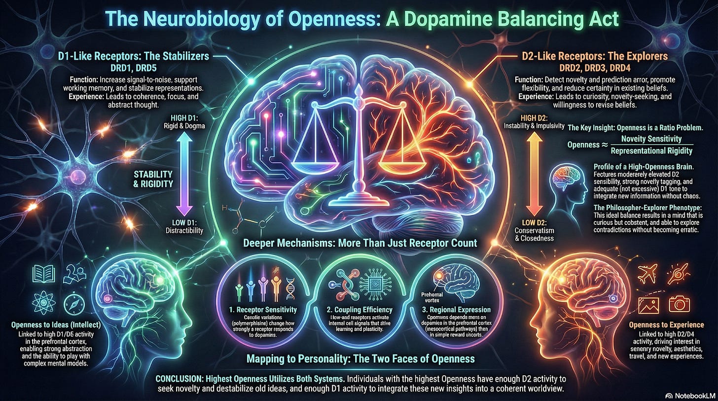 This is intended to cover individual meaningful experiences that you could say are the polar opposite of trauma. This is highly individual because it depends on you, although there is some overlap. People with high encoding fidelity and thin boundaries tend to be more sensitive to peak experiences. Openness as a personality trait is largely mediated by dopamine, but as a synthesis between ratios, sensitivities, plasticity across dopaminergic systems, and how they interact and couple with the cortex and affect. Trait openness is best described as a readiness to update internal models in response to novelty, complexity, and uncertainty. Especially since dopamine is highly involved in precision-weighting. Just realize dopamine has different receptor families, which mediate different responses. Because this also sets the stage for your sensitivity to flow states.