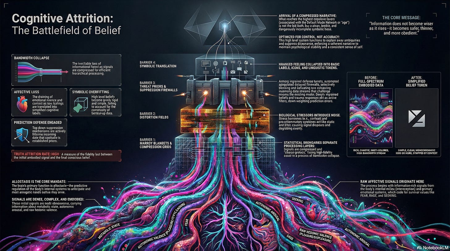 There’s a saying, “truth is the first casualty of war”, which is pretty poetic and fitting. Truth in this case relates to the confidence (precision) in the predictions of those generative models. We know the external world can get noisy, literally. This principle extends to the internal world, inflammation, oxidative stress, and other stressors like depletion or deficits can create noise in the system. Outside of noise, if we return to the modes of communication between layers and their boundaries, certain signals never make it through, even when they are important. As we discussed in the neural architecture, you have lower-order layers and higher-order layers, all with their own functions and an “information preference”, the information that is relevant to that layer at that very moment. Poor interoception and arousal coherence, that is, arousal and affective systems information matching, contributes significantly to a considerable mismatch of information between higher-order levels and lower-order levels.